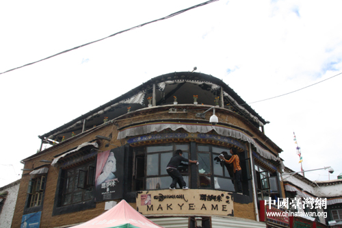 坐落在八廓街的東南角的瑪吉阿米餐廳(makye ame),瑪吉阿米,藏語(yǔ)中即“未嫁娘”之意,出自六世達(dá)賴倉(cāng)央嘉措的情詩(shī),相傳是倉(cāng)央嘉措情人的名字,而當(dāng)年倉(cāng)央嘉措與瑪吉阿米幽會(huì)的地方,正是圖片所示的土黃色小樓。(中國(guó)臺(tái)灣網(wǎng) 李典典 攝)