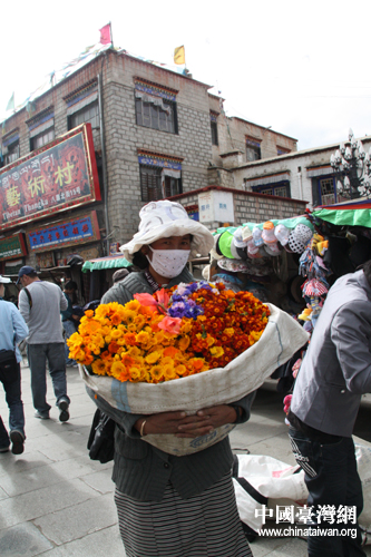 八廓街上賣花的藏族女子(中國(guó)臺(tái)灣網(wǎng) 李典典 攝)