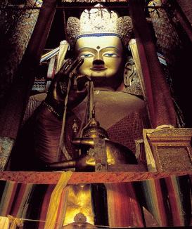 后藏首城日喀則,有一座聞名中外的宏偉建筑——扎什倫布寺。該寺最為著稱的佛殿(強巴佛殿),系九世班禪曲吉尼瑪于公元一九零四年興建。殿高近三十米,建筑面積近八百平方米,殿室分為蓮花寶座殿、腰部殿、胸部殿、面部殿和冠部殿五大層。殿內供有世界最大的鍍金強巴銅坐佛像。其蓮花寶座高3.8米,佛像高22.4米,總高26.2米,面部約4.2米。耳長2.8米,手掌寬約1.6米,中指長約1.6米,中指粗周長1米,腳底長約4.2米,肩寬11.4米,佛像鼻孔可容一個成年人。