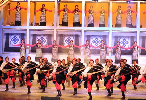 資料圖片:2008年12月17日,西藏日喀則拉孜農民藝術團在表演《飛弦踏春》。新華社記者 格桑達瓦 攝