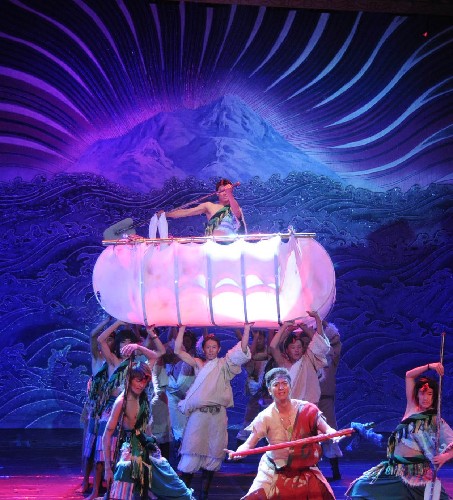 圖為演員在表演舞蹈《牛皮船》。2009年5月1日晚,由西藏文化廳和西藏珠穆朗瑪集團有限公司聯合打造的大型唐卡式歌舞詩《幸福在路上》在拉薩進行了首次商業演出,吸引了眾多游客前來觀看,為逐步升溫的西藏旅游市場又增添了一抹亮色。新華社記者 涂洪長 攝