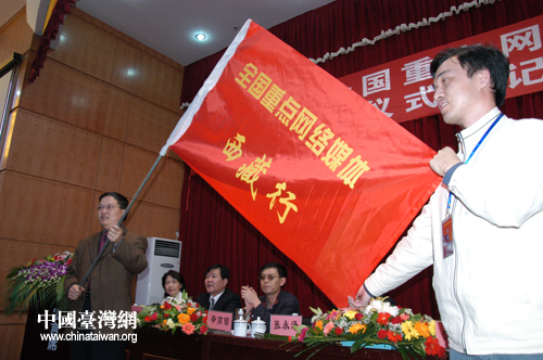 西藏自治區黨委宣傳部常務副部長沈開運向全國重點網絡媒體代表授旗(中國臺灣網 李典典 攝)