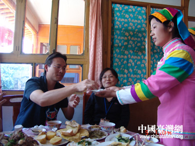 欣賞完了土族人民的精彩表演,兩岸記者還到土族農家做客,品嘗土族農家特色風味,兩岸記者們受到了土族人民的熱情接待。土族人民用土族的迎客禮儀來招待兩岸記者。土族農家全家在大門口外迎接兩岸記者,先獻上象征吉祥如意的哈達,敬兩岸記者們“進門三杯酒”,記者們進家門后,上炕入座后再敬“吉祥如意三杯酒”,招待記者的菜肴也是當地頗具代表性的農家風味,筵席結束后,主人還殷勤地為客人送上“上馬三杯酒”,預祝兩岸記者一路平安。兩岸記者也被土族人民的熱情好客深深感動。(謝曉萍)