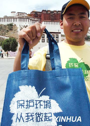 資料圖片:2004年6月12日,拉薩環保“布袋行動”志愿者貢覺在布達拉宮前展示環保布袋。新華社發