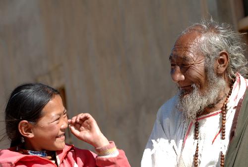 資料圖片:藏北那曲鎮一對祖孫倆(2006年6月13日攝)。新華社記者 覺果 攝