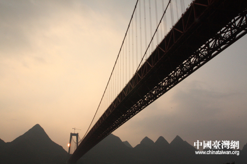 壩陵河大橋橋長1564米、主跨1088米、最高橋墩202米、橋面高度370多米(中國臺灣網 楊永青 攝)