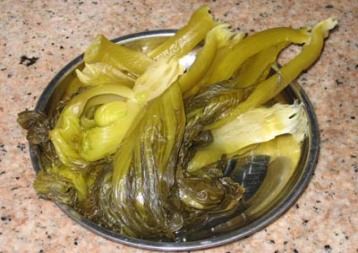 縣境苗族人民喜食酸辣味湯菜,家家戶戶都有酸菜、酸湯和酸辣子。苗族的酸菜味鮮可口,制作方便。將收割下來的青菜、白菜、韭菜、蘿卜等洗凈曬干,切細,調(diào)糯米粉、糯米飯或米湯、辣面、鹽水等與菜拌勻腌于壇內(nèi)即成。生食可作勞作午餐的下飯菜,冰雪封凍時節(jié)可開湯就食。平時煮新鮮蔬菜或瓜豆,摻與酸菜或酸湯,食后既可健胃生津,又可清火祛熱。暑天將酸菜開成清湯或將生酸菜泡以涼井水,是十分可口的解渴飲料。