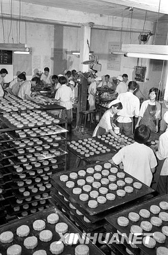 1979年中秋前夕,上海市50多家生產中秋月餅的工場,已從月初開爐生產各自的特色月餅。這是上海利男居工場正在生產各種廣式月餅。新華社記者唐允仁攝