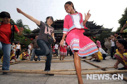 9月13日,游客在張家界土家風情園與當地群眾一起跳竹排舞。中秋小長假期間,湖南張家界吸引了眾多國內外游客前來旅游。新華社記者 龍弘濤 攝