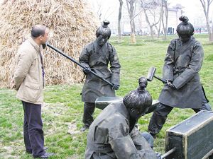18日,揚州宋夾城遺址公園舉行“雕塑展”。不過,這些“雕塑”都是“真人秀”。一名表演者告訴記者,他們都是揚州職業大學的學生,經過培訓后在這里表演“活雕塑”。據介紹,他們每小時能掙一百元,因長時間保持不變的姿勢動作,這錢掙得很是辛苦,一般一小時左右就要換一次人。上圖為一個游客湊上前去,看看到底是“雕塑”還是“真人”。