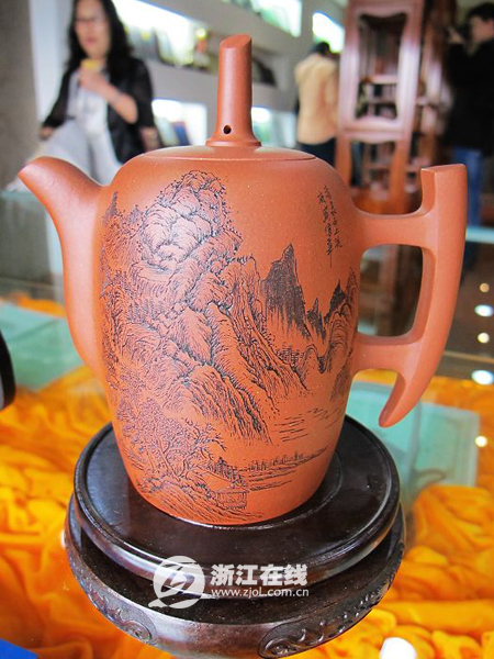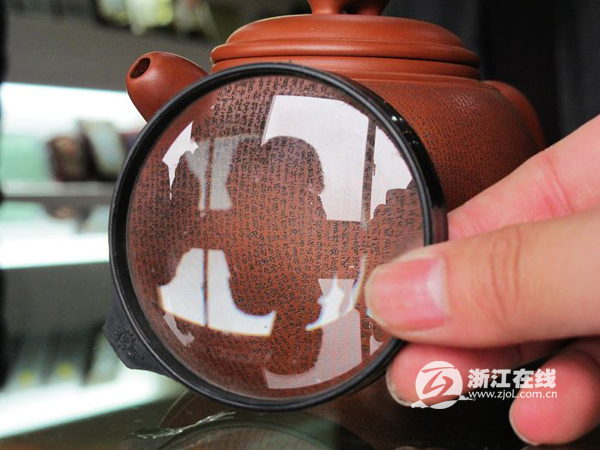在這些紫砂壺中,最讓人稱奇的是一把茶壺上刻了3000多字。這件作品是紫砂專家、浙江省民間工藝美術大師吳偉華的杰作,而這種在紫砂上進行微雕的技術,也是他近年來的獨創(chuàng)。
