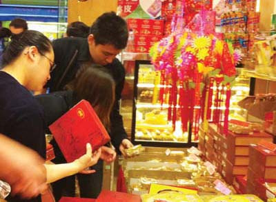 中秋將至,中國城里幾乎所有的大超市以及餅屋都為月餅設(shè)立了“專柜”,各式包裝精美的月餅被擺放在各超市最顯眼的位置。