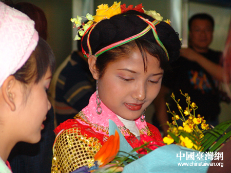 中華海峽兩岸原住民暨少數民族交流協會理事長,即臺灣少數民族代表團團長華加志和夫人走在了最前面,剛一出機場通道就受到了國家民委、云南政府和省民委領導的熱烈的歡迎,云南的少數民族姑娘們親手為華先生及夫人戴上了象征“吉祥如意”的香包,獻上了鮮花和祝福。圖為美麗的云南姑娘。(于小亮)