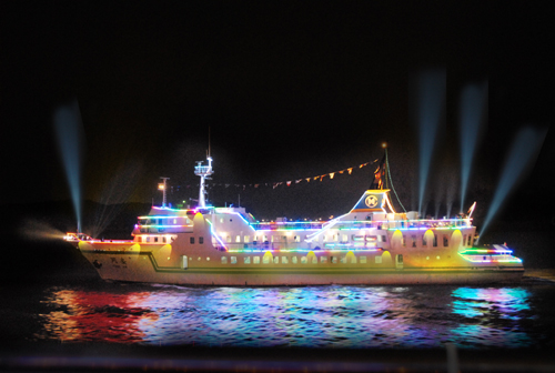 在廈門主會場上的獨立主持平臺和觀眾席兩側,以“團圓兔”中秋吉祥圖案以及海鷗、彩云、風帆、航船和魚所組成的大型燈飾帶連綿不絕,形成中秋之夜海上大型燈會的景觀效果。