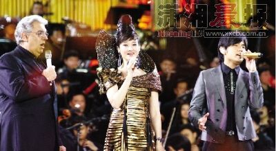 宋祖英、多明戈、周杰倫在鳥(niǎo)巢同臺(tái)演出。