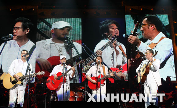 1月2日晚,“縱貫線”樂隊2010年首場演出在江蘇省無錫市體育中心體育館舉行,一首首經典老歌和最新創作的歌曲為現場觀眾帶來視聽享受。新華社發(宦瑋 攝)