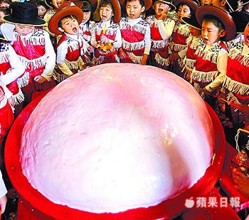 萬斤米糕桃。南投縣松柏嶺受天宮制作重1萬臺斤、號稱全臺最大的元宵超級米糕桃,昨舉行開香揭桃儀式。廟方表示,因玄天上帝腳踩龜、蛇,為了對龜神表示敬意,才將米糕龜改為米糕桃 。來源:臺灣《蘋果日報》 |