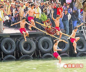 跳海求降福。臺北縣野柳神明凈港文化祭昨天上午8時許登場,今年共有8頂神轎參與凈港,在加油聲浪中,壯丁們扛著神轎躍入冰冷海水,上岸后再進行過火,祈求神明降福,現場熱鬧非凡。來源:臺灣《蘋果日報》