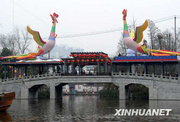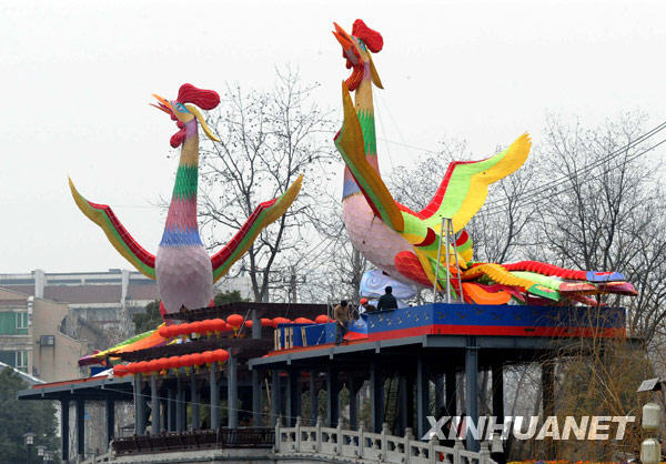 2月8日,藝人們在南京白鷺洲公園安裝臺灣鳳凰燈。