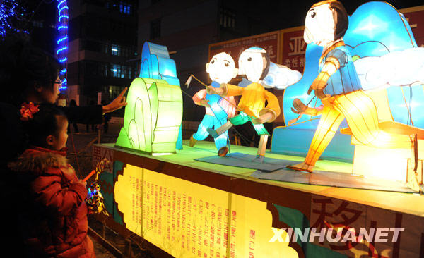 2月26日,西寧市的一對母女在觀看寓教于樂的民間傳說故事燈。