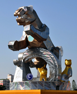 中新網2月24日電 據“中央社”報道,2010臺灣燈會主燈“福臨寶島”23日完成。亮灰色大虎加上2組金色Q版幼虎燈,不僅姿態宏偉,兼具歡樂溫馨氣氛,整體造型宏偉富巧思。