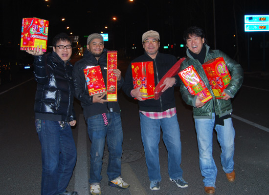 飯后,4人花了1萬元人民幣買了4大箱鞭炮,把保姆車隨意停大馬路中間,就在北京大街上開始放鞭炮,周華健怕炮聲,找借口說要負(fù)責(zé)維持粉絲秩序,一溜煙就沖到路旁。李宗盛拿了香及鞭炮,就是不敢點(diǎn),最后索性承認(rèn)自己沒膽放。羅大佑及張震岳膽子最大,搶著放炮還與工作人員PK。