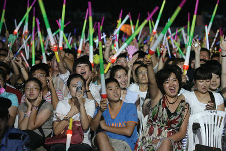 盡管大連理工大學體育場能容納的觀眾遠不及觀眾熟悉的大連市體育場,但昨晚“小平島之夜”縱貫線大連巡回演唱會依舊涌出人海狂潮的撼人場面,離7時30分演唱會開始尚有很長時間,看臺上的觀眾早就因激情難耐而自發大合唱了。