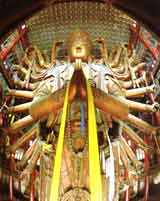 位于承德市避暑山莊之北,因寺內有木雕大佛,又稱大佛寺,建于清乾隆二十年至二十三年(1755~1758年)。此寺仿西藏三摩耶廟形式而建。按佛教教義關于世界構造的模型布局,中央的大乘閣象徵須彌山,四周的殿宇象徵四大部洲。安遠廟是仿新疆伊犁固爾扎廟修建。普陀宗乘之廟和須彌福壽之廟,前者信拉薩布達拉宮后者仿扎什倫布寺修建。這些建筑藝術形象既反映了民族團結,又起到了民族間建筑文化交流的作用。山莊周圍寺廟,環山莊半圓建成,呈眾星捧月之勢,政治寓義十分明確。從收效看也確實是“一座喇嘛廟,勝抵十萬兵”。 全寺占地約2.3萬平方米,主要建筑有鐘鼓樓、碑亭、天王殿、大雄寶殿、大乘閣等。大乘閣高36.75米,外觀六層重檐。閣內置木雕千手千眼觀音貼金立像,高22.23米。用松柏榆杉椴五種木材雕成,是國內現存的最大木雕佛像之一,已經被錄入《吉尼斯大全》。佛像兩側有善財、龍女侍立,造型圓潤。閣兩側有妙嚴室和講經堂,分別是清帝聽經和休憩之所。